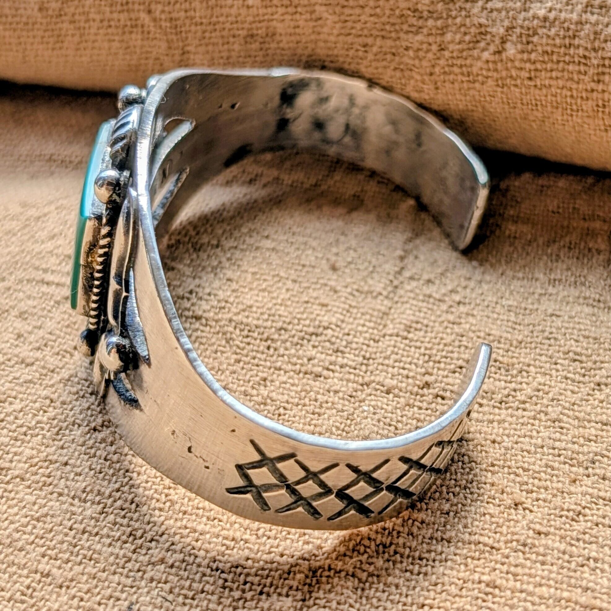 重厚なシルバーの中央に鎮座するのは、まるで守護盾(シールド)のように力強くカットされた鮮やかなグリーンターコイズ。不純物が少なく、吸い込まれるような深い色合いを持つ美しいグリーンターコイズです。周囲には立体的なアップリケ技法による装飾が施されており、圧倒的な存在感を放ちます。