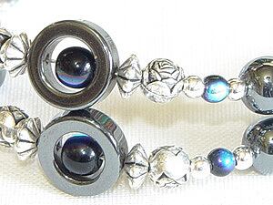 ドーナツ型に美しく研磨されたヘマタイトを中心に、その内部に幻想的な「シーオパール」を閉じ込めた、非常に技巧的で豪華な2連ブレスレットです。 サイドには大粒の雫型ヘマタイトを配置。メタリックな輝きと、シーオパールの深みのある色彩が調和し、落ち着いた中にも圧倒的な華やかさを感じさせます。 2007年当時の職人の遊び心と美学が詰まった、他にはない個性が光る一点物です。
