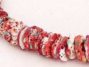 大小様々な天然サンゴをおしげもなく多彩に使い、ひとつひとつ丁寧に手間と時間をかけて磨きあげ、手作りされたヒシネックレス。一つとして同じものがないといわれるほど洗練された重量感のあるインパクトとデザインに仕上がっています。アクセントにターコイズ模様の斑点も加工もされております。天然サンゴは悪運を遠ざけ、運気を上げるパワーストーンと言われています。
