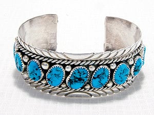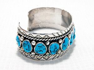 幅広のバングル全体に、なんと!13個のターコイズが豪華絢爛に施されたアート作品!