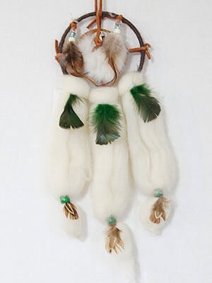 円の中心部にはサラサラのウサギの毛、円の下の部分にはフワフワな羊毛が使われ、中心部はフェザーやコンチョなどで装飾されています。