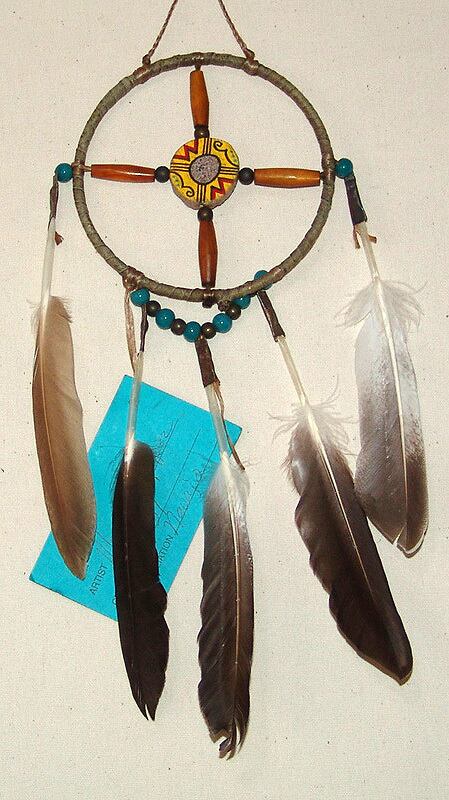 現地のナバホ族が丁寧に制作したメディスン・ホイールで、クロス中央部分の鹿の角にはきれいなデザインも装飾されています。自然な雰囲気で多数の羽根の装飾と中央に配置された鹿の角のデザインの色合い・組合せがとてもかっこいい作品です。