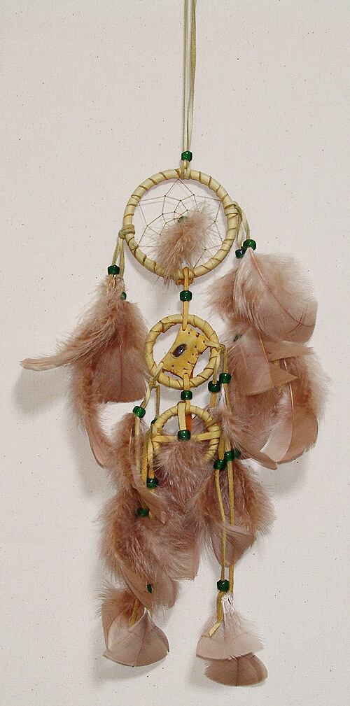 ベーシックなベージュの革を巻いたサークル(輪)を3つ連ねたドリームキャッチャー。
