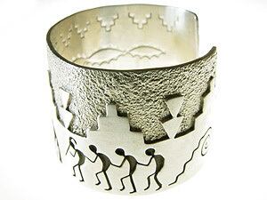 インディアンのプエブロ住宅やココペリなどのデザインがオーバーレイ技法により施されています。さらに!表面と裏面の異なるデザインもこのバングルこだわりのおすすめポイントです!!