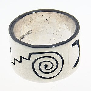 自然をモチーフにしたデザインがリング周囲に刻印されており、付け方によっていろいろな表情を楽しむことができます!黒燻し加工によりデザインが際立ちさらに印象的な作品となっています。