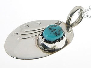 ペンダントトップには、スタンプワークによってシルバーに刻印されたデザインと、はめ込まれたワンポイントの天然石のターコイズがシンプルでかわいい仕上がりになっています。
